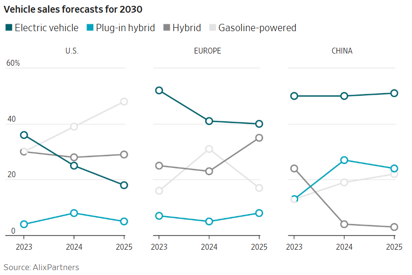 In the U.S., AlixPartners now predicts EVs will make up 18% of new-vehicle sales by 2030, half of what it expected two years ago.