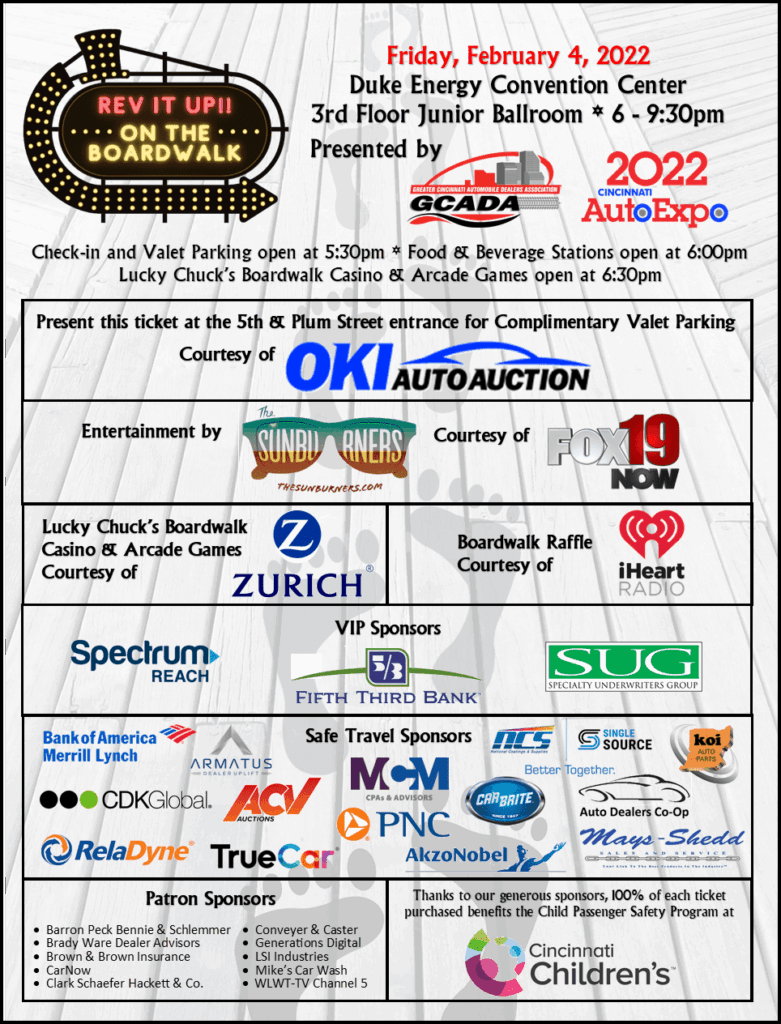 Since 1993, GCADA our annual REV IT UP!! VIP Party on opening night of the Cincinnati Auto Expo has raised funds that directly benefit the Cincinnati Children’s Child Passenger Safety Program. The program educates parents, guardians and family members about the proper fit and use of child safety and booster seats with the goal of reducing injuries and deaths among our youngest passengers should they be involved in an auto accident. The program also provides car seats to families and caregivers burdened with financial or special medical needs.